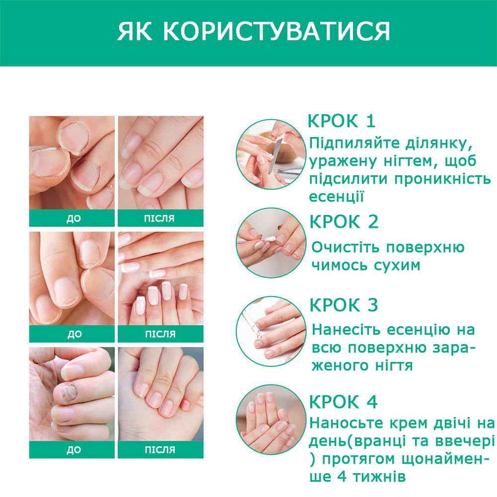 Спробувала 6 різних продуктів, цей був найуспішнішим. Діє трохи довше, побічних ефектів немає. Покращення зовнішнього вигляду нігтів через 2 місяці.